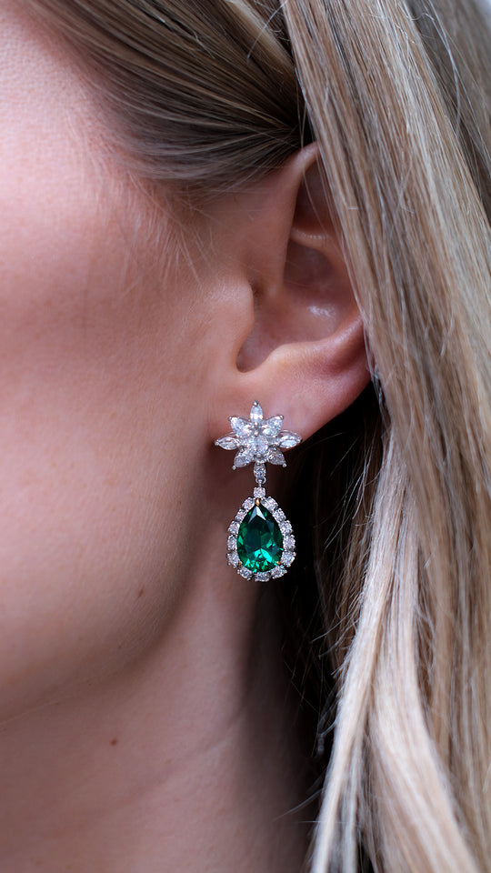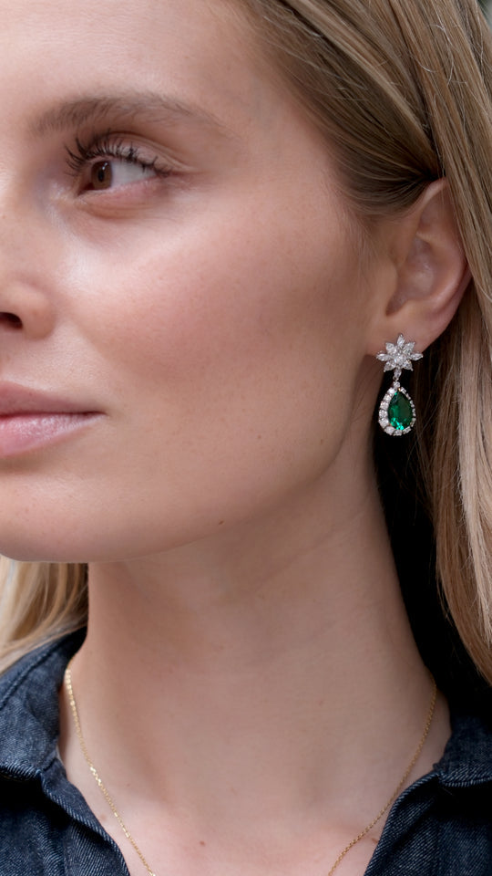 These stunning earrings feature a pear center stone in in 4ct. eq. of rich emerald green. Our master craftsman attention to detail makes the Camari Drops a perfect evening piece. Prepare to turn heads with this pair.