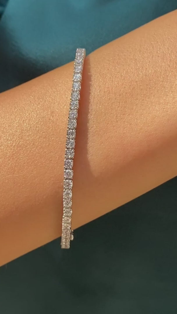 It is a staple piece for every jewellery collection. Crafted in Sterling Silver with white gold plating, this simple yet elegant line bracelet comprises our Round Brilliant stones, exquisitely cut and polished to give the ultimate sparkle.